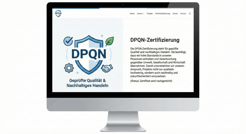 Die DPQN-Zertifizierung steht für geprüfte Qualität und nachhaltiges Handeln. Sie bestätigt, dass wir hohe Standards in unseren Prozessen ein-halten und Verantwortung gegenüber Umwelt, Gesellschaft und Wirt-schaft übernehmen. Damit unterstreichen wir unseren Anspruch, Projekte nicht nur qualitativ hochwertig, sondern auch nachhaltig und zukunfts-orientiert umzusetzen.